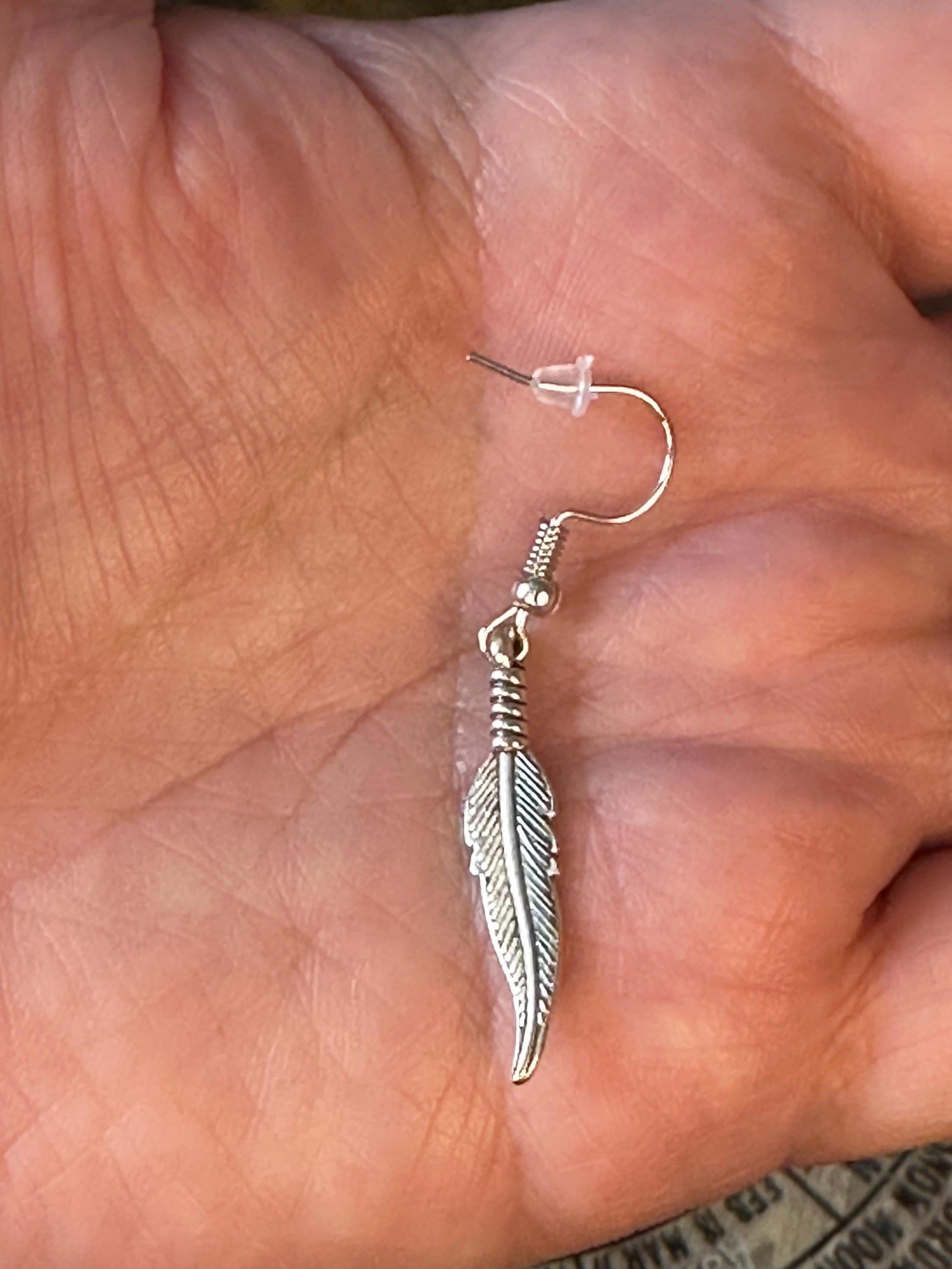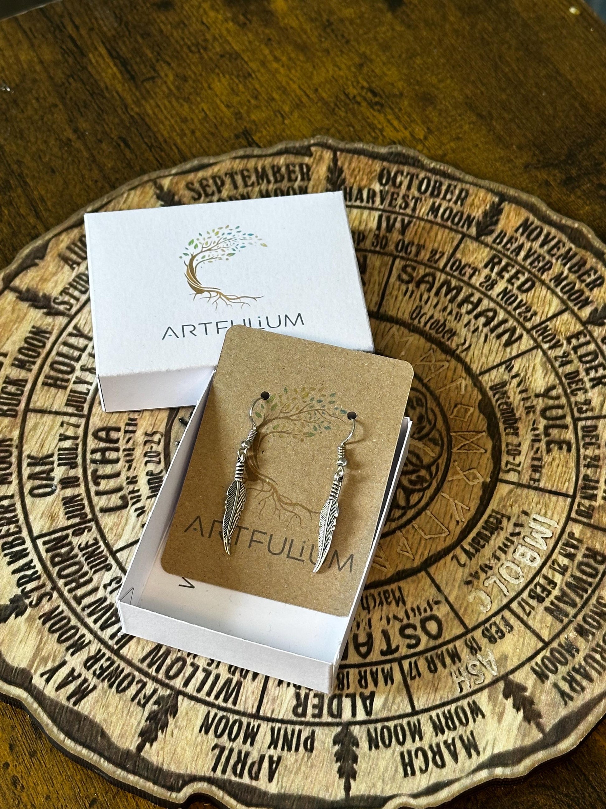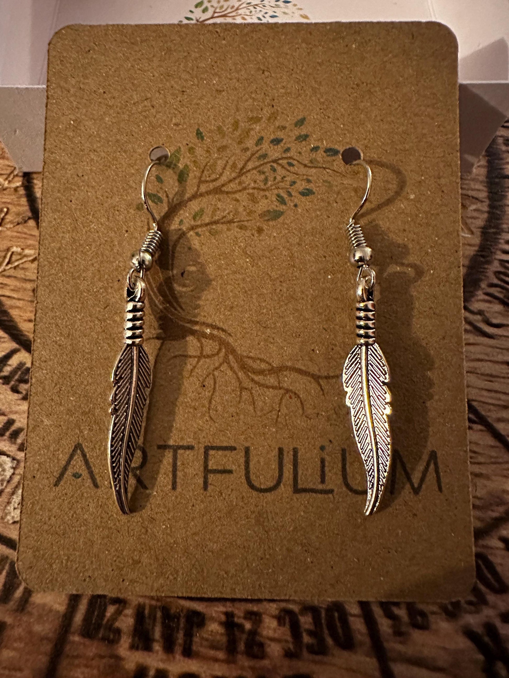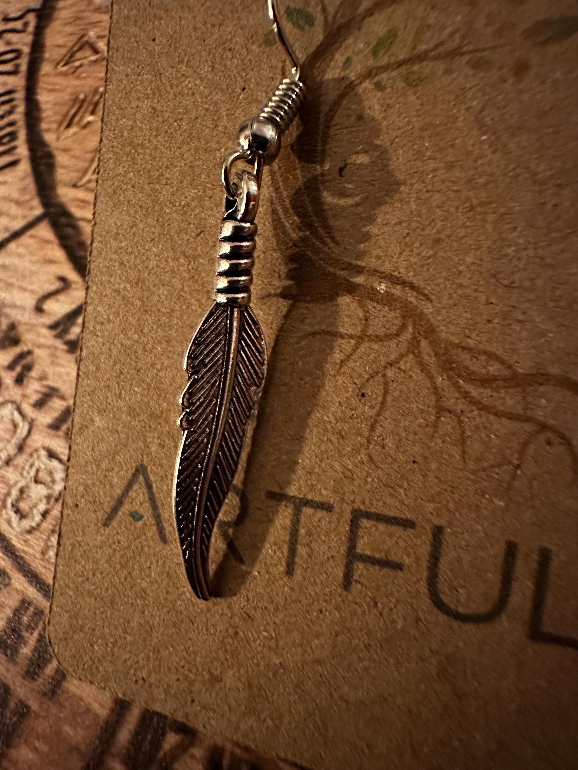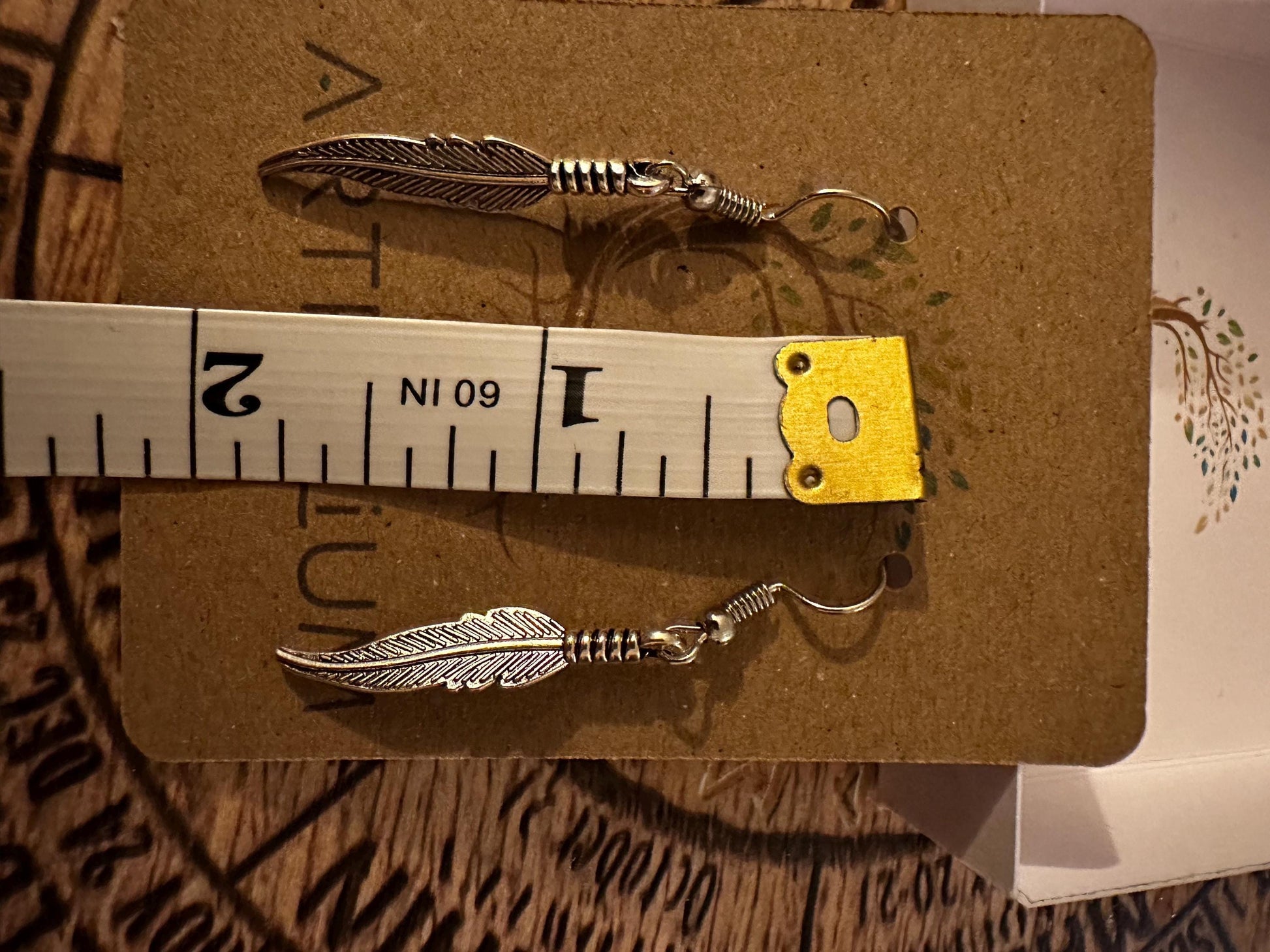 - Materials: Zinc alloy feather with antique metallic finish + hypoallergenic stainless steel hooks.