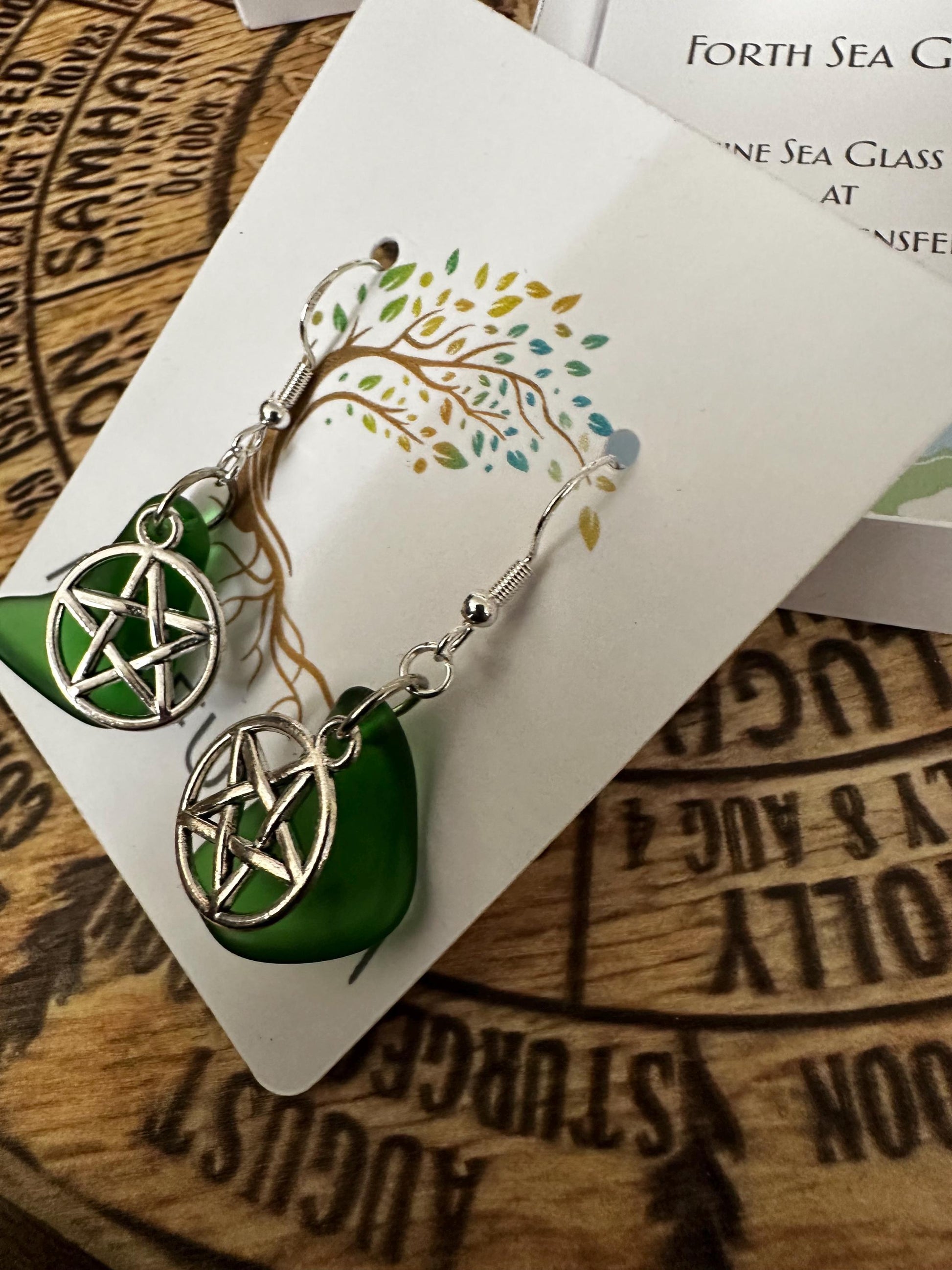 Pentacle Seaglass Earrings • Silver Plated Pagan Jewelry • Wiccan Charm Dangle • Scottish Coastal Gift