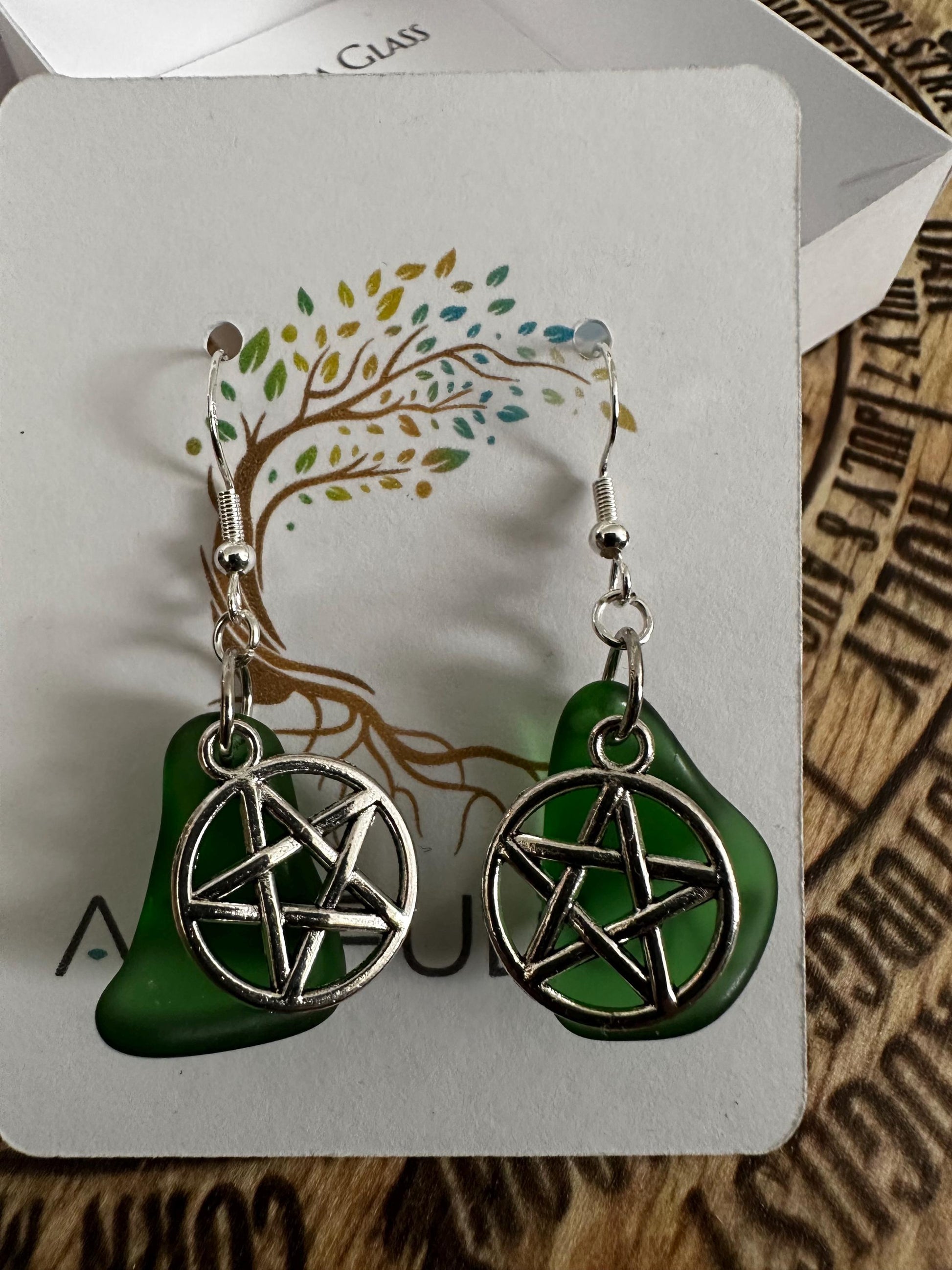 Materials: Authentic sea-tumbled glass (1.5" drop) + zinc alloy pentacle charm + silver-plated earwires.