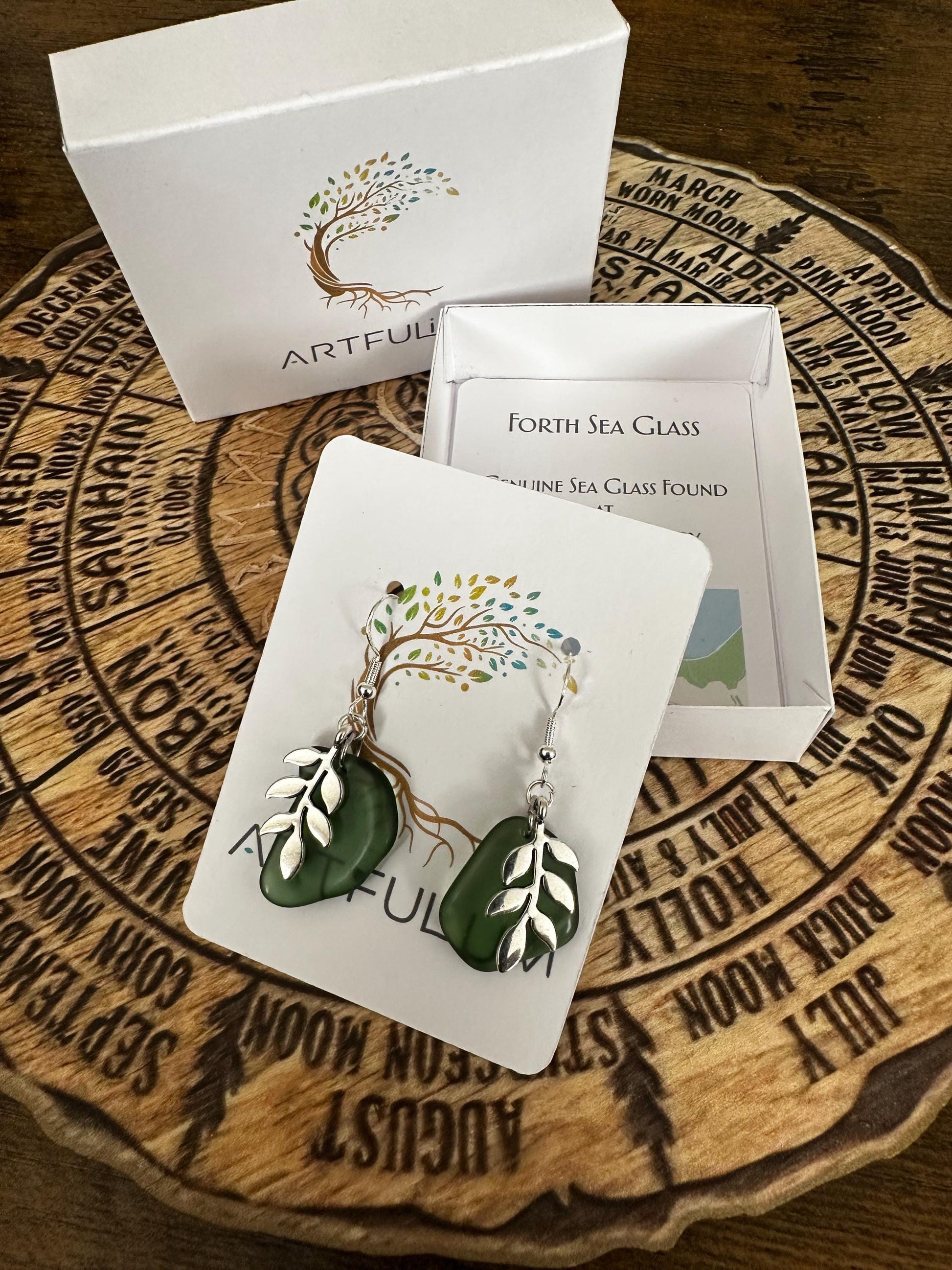 Each pair of earrings features genuine Scottish seaglass collected from the shores of South Queensferry, polished by the sea into a soft, frosted gem. Paired with a delicate silver-toned zinc alloy leaf charm, these dangle earrings embody the serene beauty of Scotland’s coastline.